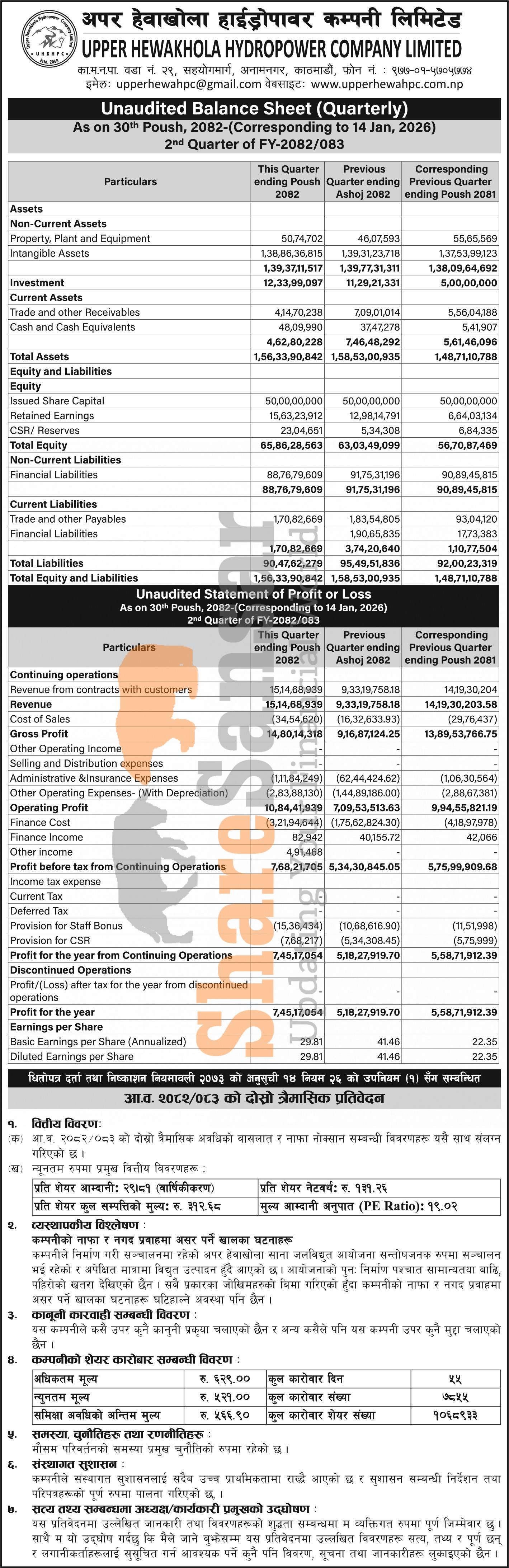 Upper Hewakhola Hydropower Company Limited has posted a net profit of Rs 74.51 million and published its 2nd quarter company analysis of the fiscal year 2082/83.
