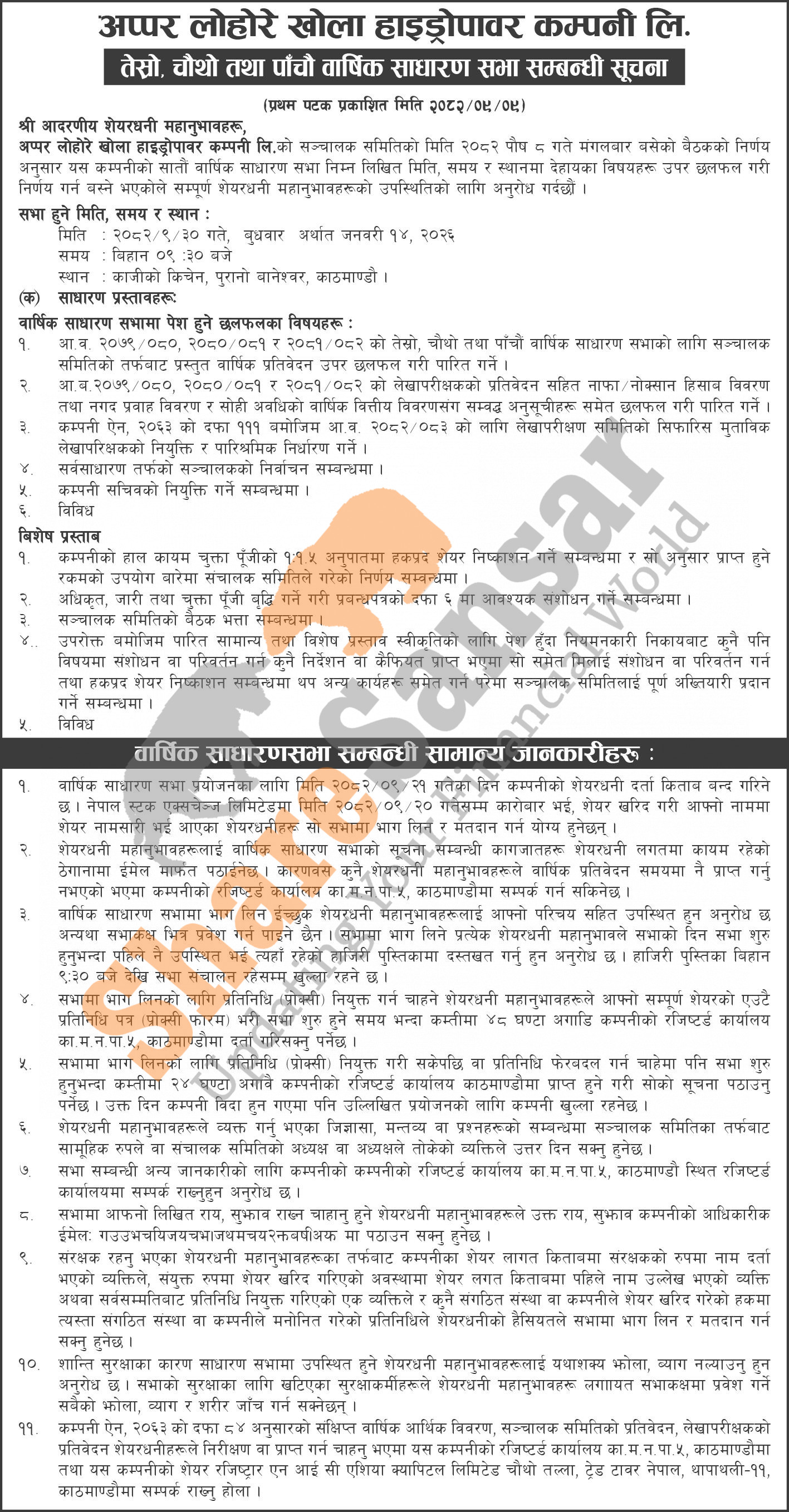 Upper Lohore Khola Hydropower Company Limited has announced its 3rd, 4th and 5th AGM going to be held on 30th Poush, 2082.