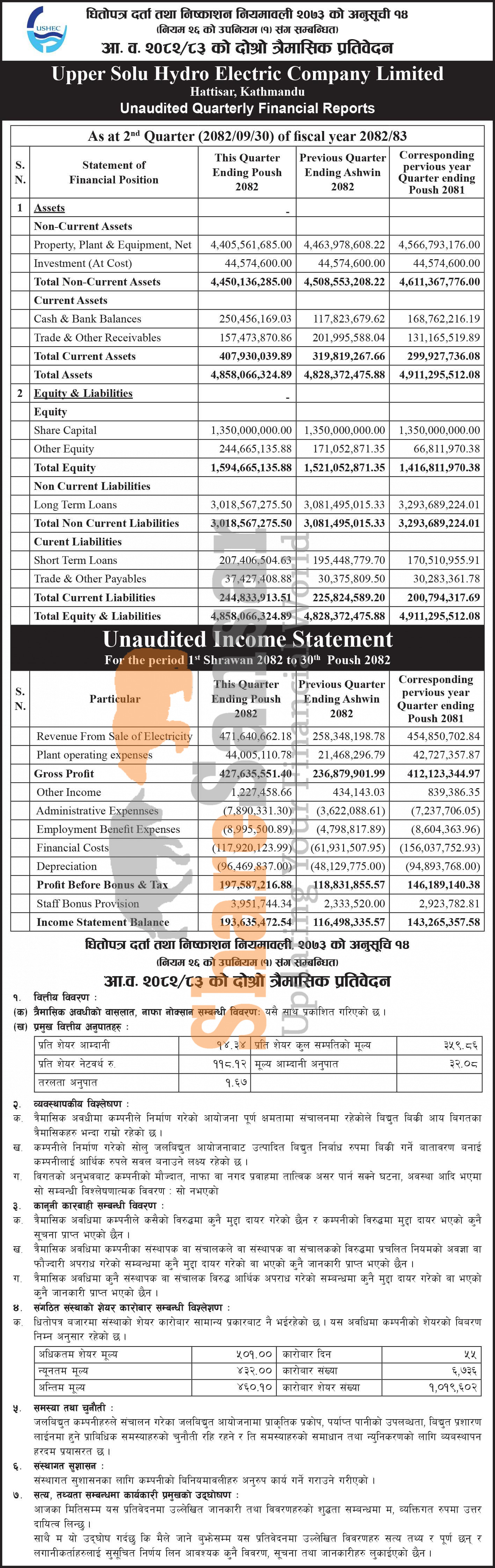 Upper Solu Hydro Electric Company Limited has posted a net profit of Rs 193.63 million and published its 2nd quarter company analysis of the fiscal year 2082/83.