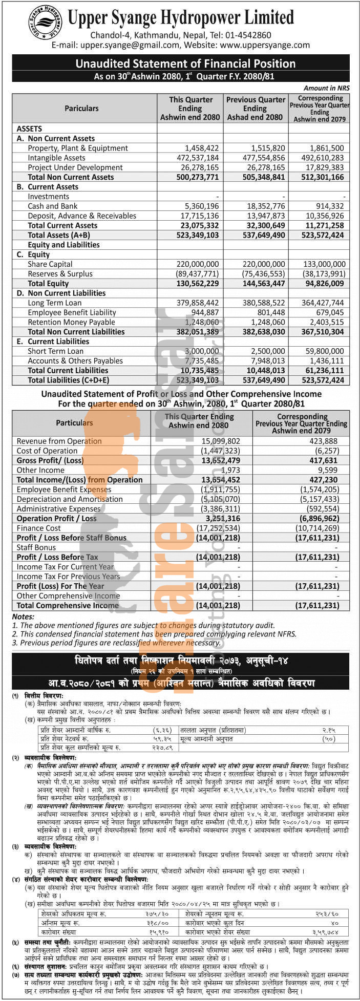 Upper Syange Hydropower Limited has posted a net loss of Rs 14 million and published its 1st quarter company analysis of the fiscal year 2080/81.