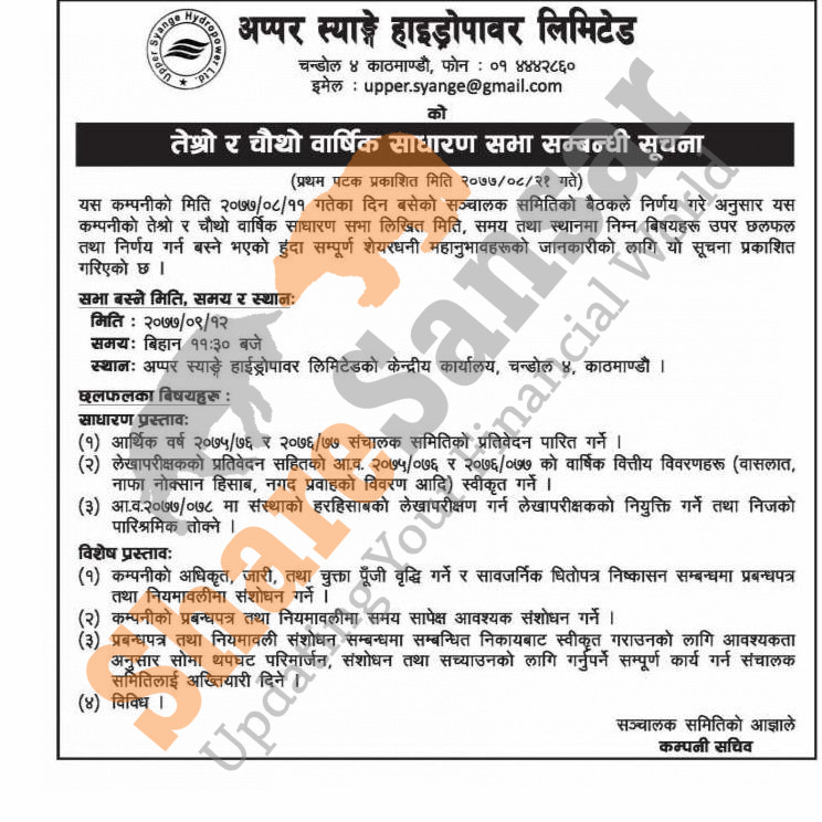 Upper Syange Hydropower Limited has announced its 3rd and 4th AGM going to be held on 12th Poush, 2077.