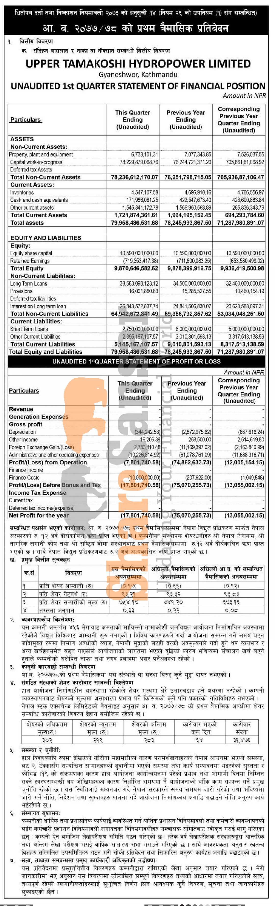 Upper Tamakoshi Hydropower Limited has posted a net loss of Rs 17.80 million and published its 1st quarter company analysis of the fiscal year 2077/78.