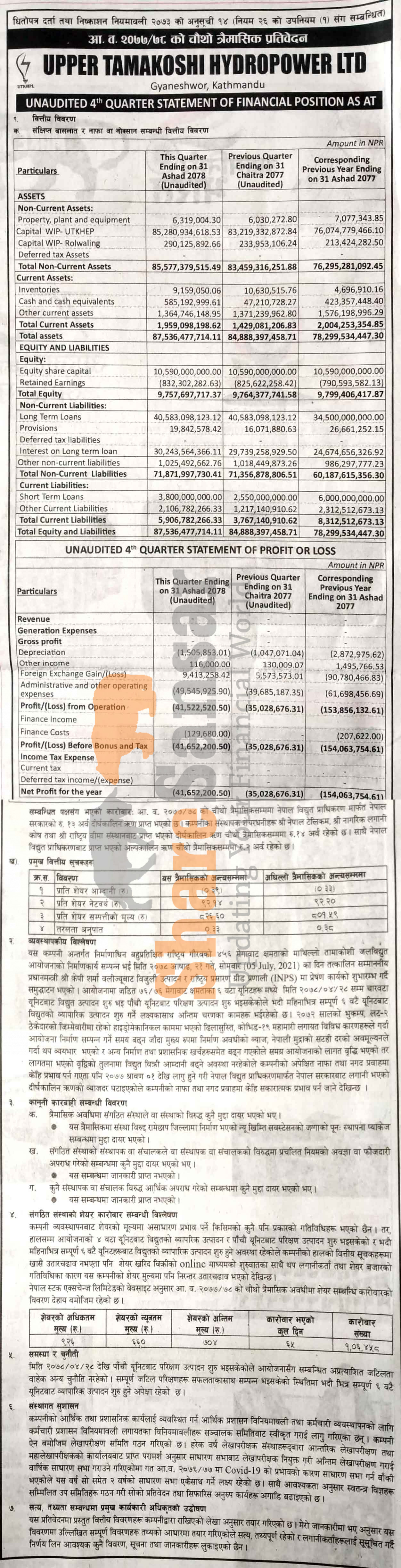 Upper Tamakoshi Hydropower Limited has posted a net loss of Rs 41.65 million and published its 4th quarter company analysis of the fiscal year 2077/78.