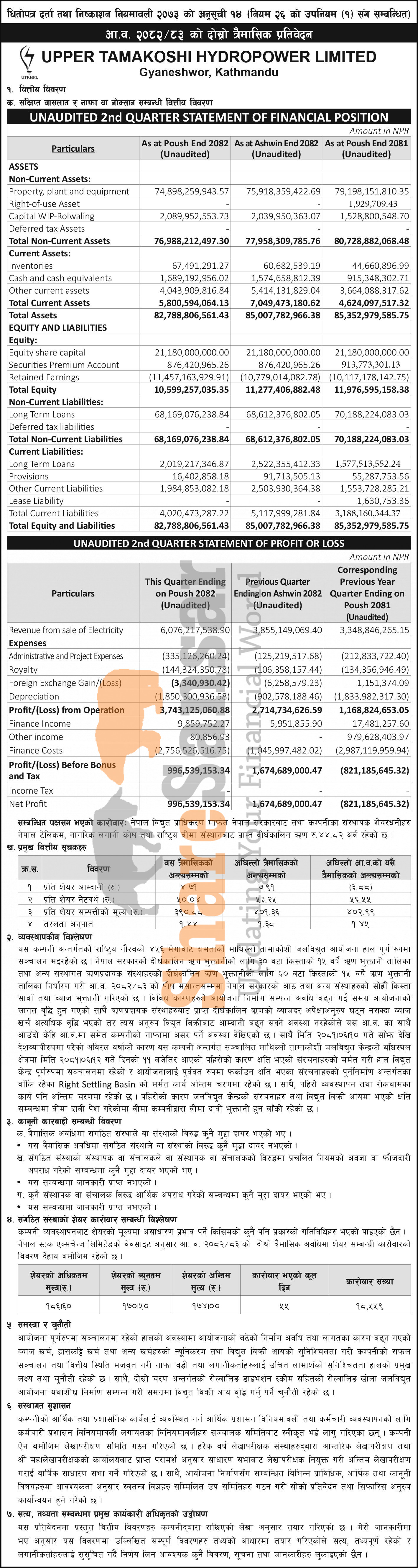 Upper Tamakoshi Hydropower Limited has posted a net profit of Rs 996.53 million and published its 2nd quarter company analysis of the fiscal year 2082/83.