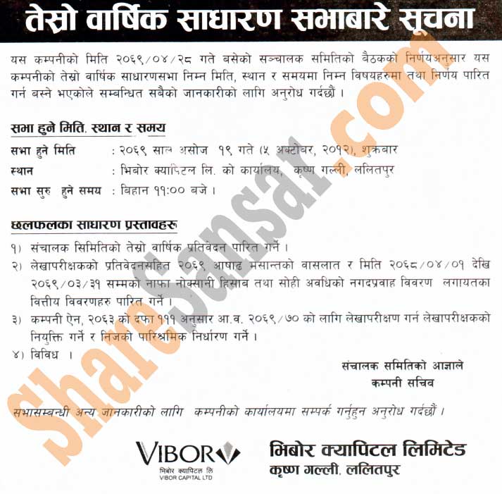 Vibor Capital Limited has announced its 3rd AGM going to be held on 19th Aswin, 2069.