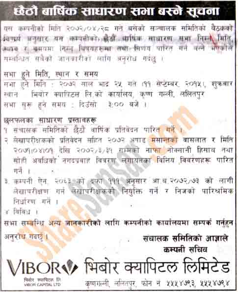 Vibor Capital Limited has announced its 6th AGM going to be held on 25th Bhadra, 2072.