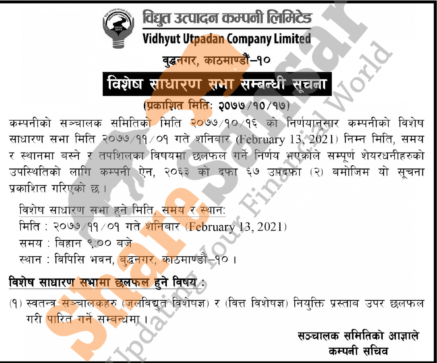 Vidhyut Utpadan Company Limited has announced its SGM going to be held on Falgun 1, 2077.