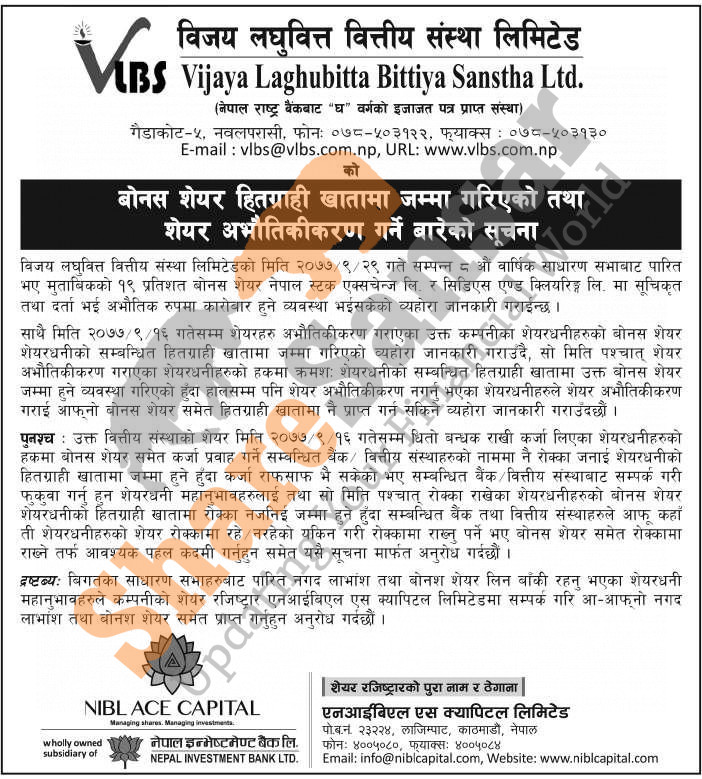 Vijaya Laghubitta Bittiya Sanstha Limited has distributed 19% bonus shares directly to DEMAT accounts of its shareholders and has urged to dematerialize their shares.