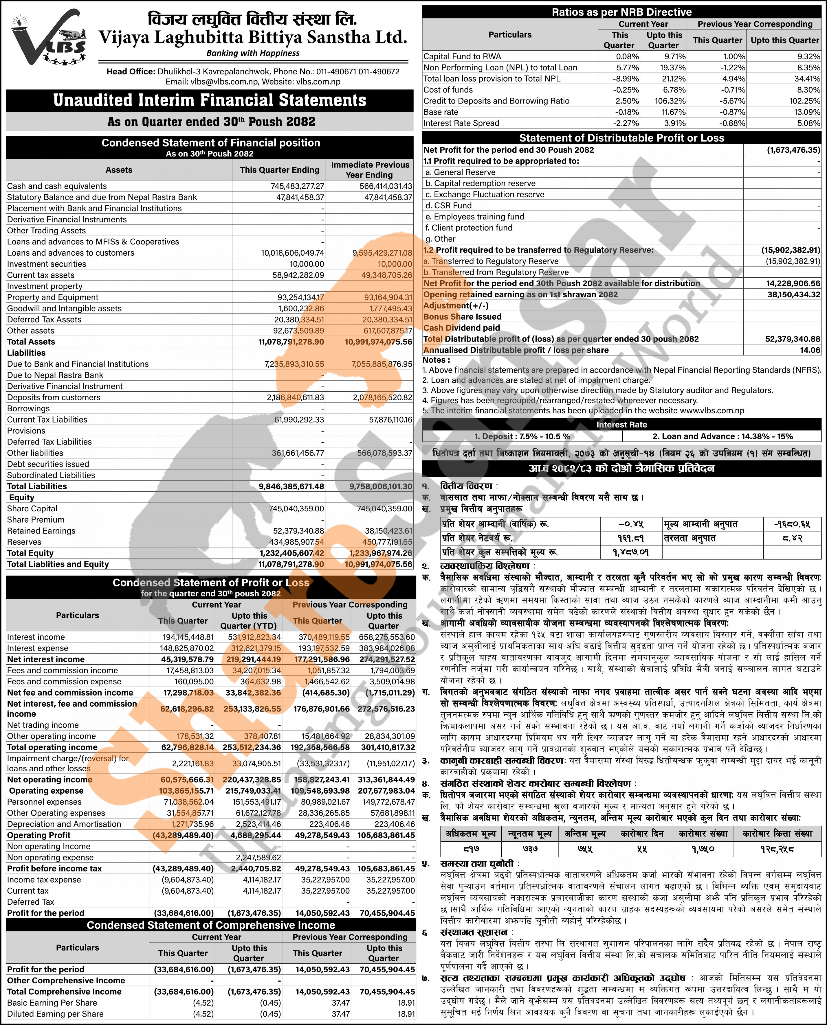 Vijaya Laghubitta Bittiya Sanstha Limited has posted a net loss of Rs 1.67 million and published its 2nd quarter company analysis of the fiscal year 2082/83.