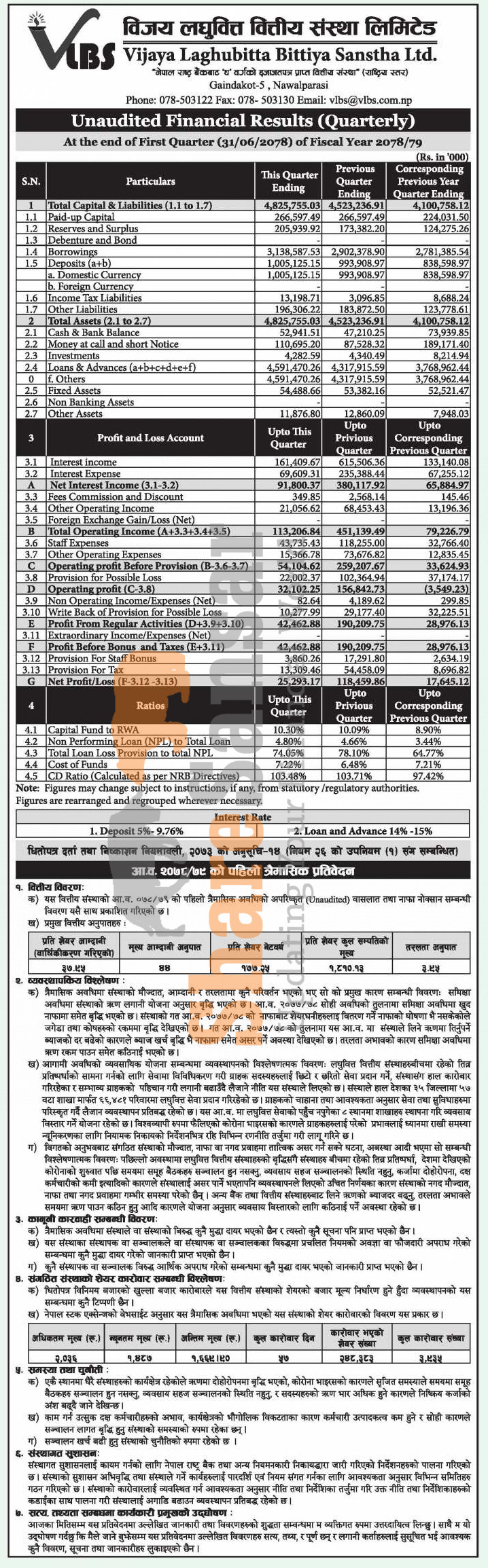 Vijaya Laghubitta Bittiya Sanstha Limited has posted a net profit of Rs 25.29 million and published its 1st quarter company analysis of the fiscal year 2078/79.