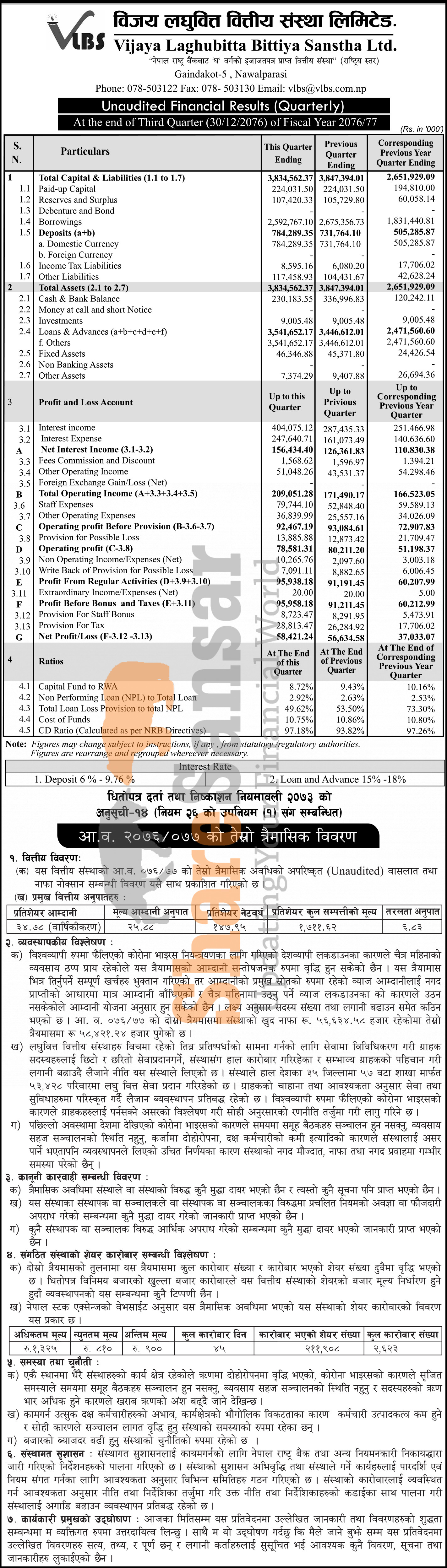 Vijaya Laghubitta Bittiya Sanstha Limited has posted a net profit of Rs 58.42 million and published its 3rd quarter company analysis of the fiscal year 2076/77.