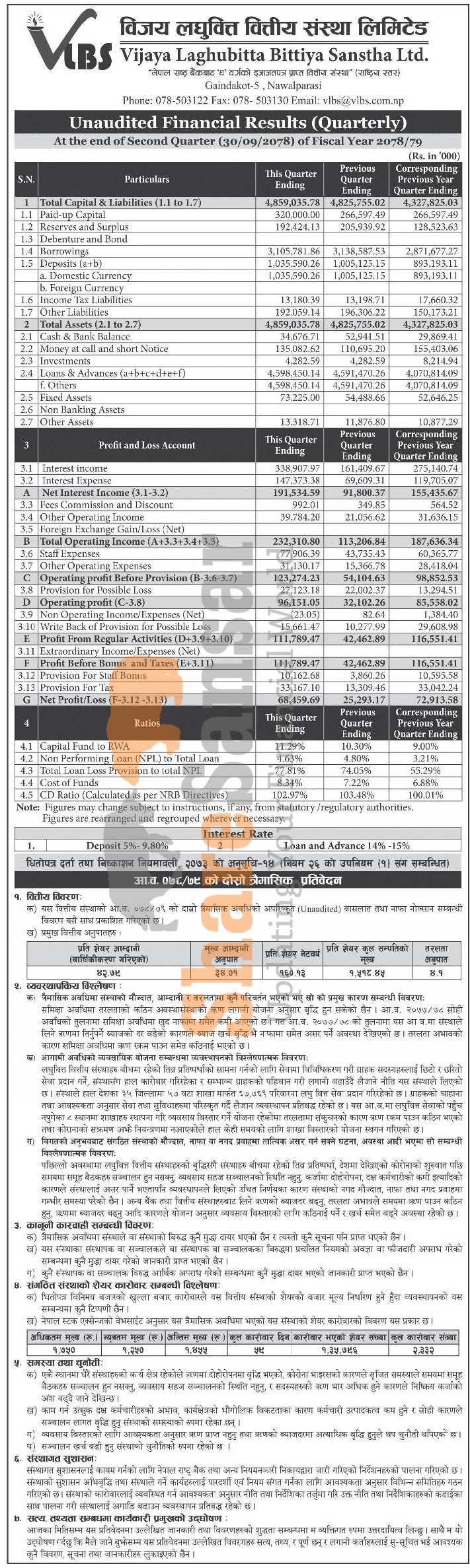 Vijaya Laghubitta Bittiya Sanstha Limited has posted a net profit of Rs 68.45 million and published its 2nd quarter company analysis of the fiscal year 2078/79.