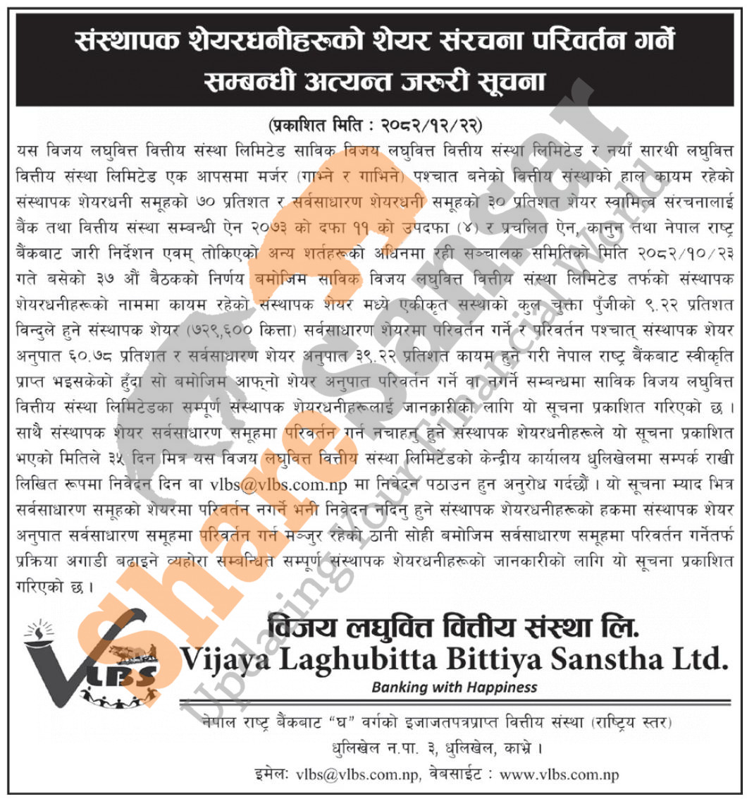 Vijaya Laghubitta Bittiya Sanstha Limited has published a notice to its promoter shareholders regarding the conversion of the share structure ratio.