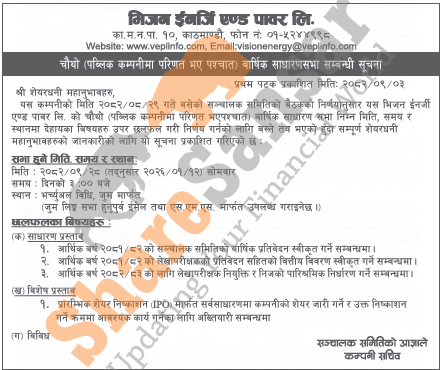 Vision Energy and Power Limited has announced its 4th AGM going to be held on 28th Poush, 2082.