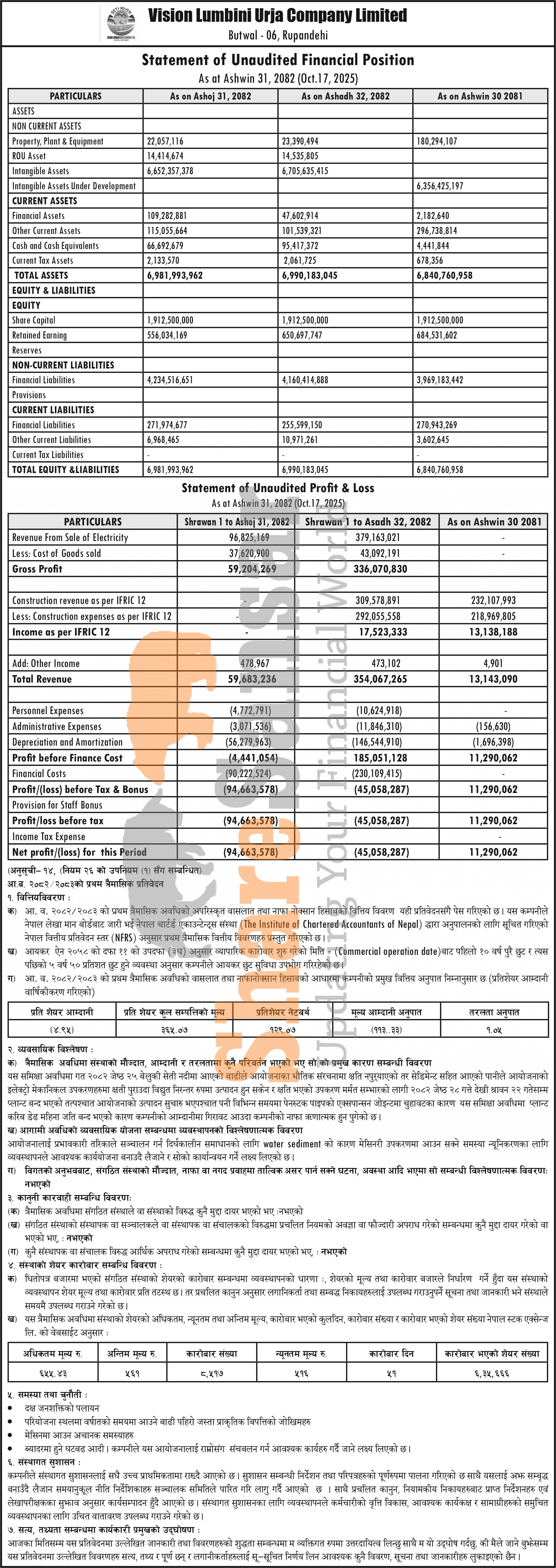 Vision Lumbini Urja Company Limited has posted a net loss of Rs 94.66 million and published its 1st quarter company analysis of the fiscal year 2082/83.