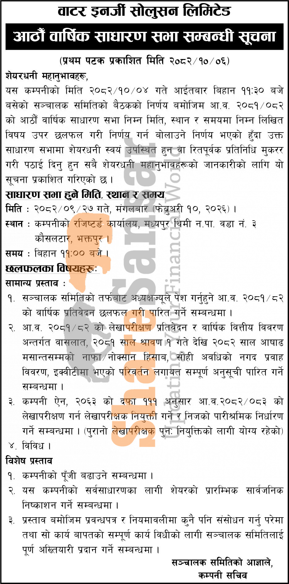 Water Energy Solution Limited has announced its 8th AGM going to be held on 27th Magh, 2082.