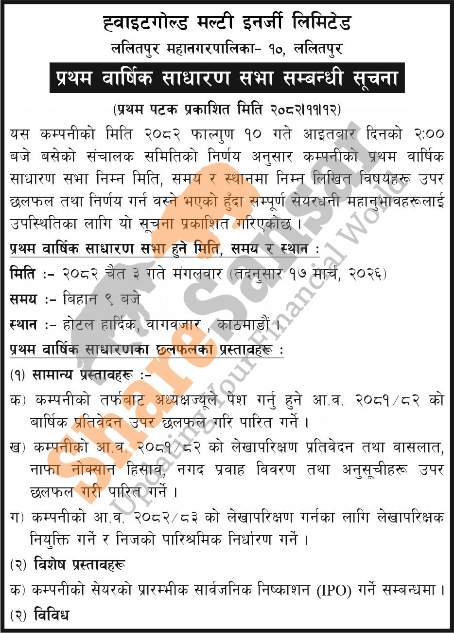 White Gold Multi Energy Limited has announced its 1st AGM going to be held on 3rd Chaitra, 2082.
