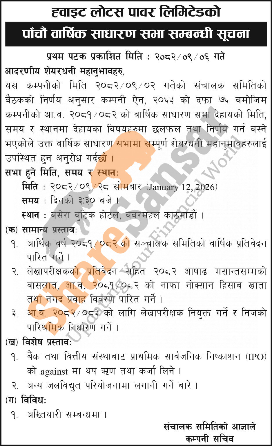 White Lotus Power Limited has announced its 5th AGM going to be held on 28th Poush, 2082.