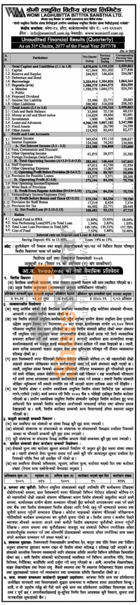 Womi Laghubitta Bittiya Sanstha Limited has posted a net profit of Rs 108.48 million and published its 3rd quarter company analysis of the fiscal year 2077/78.