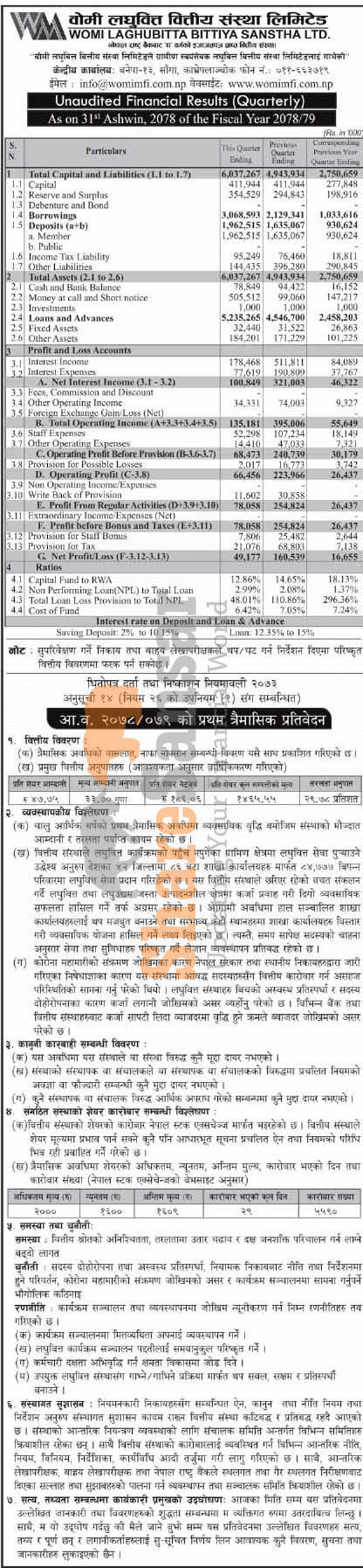 Womi Laghubitta Bittiya Sanstha Limited has posted a net profit of Rs 49.17 million and published its 1st quarter company analysis of the fiscal year 2078/79.