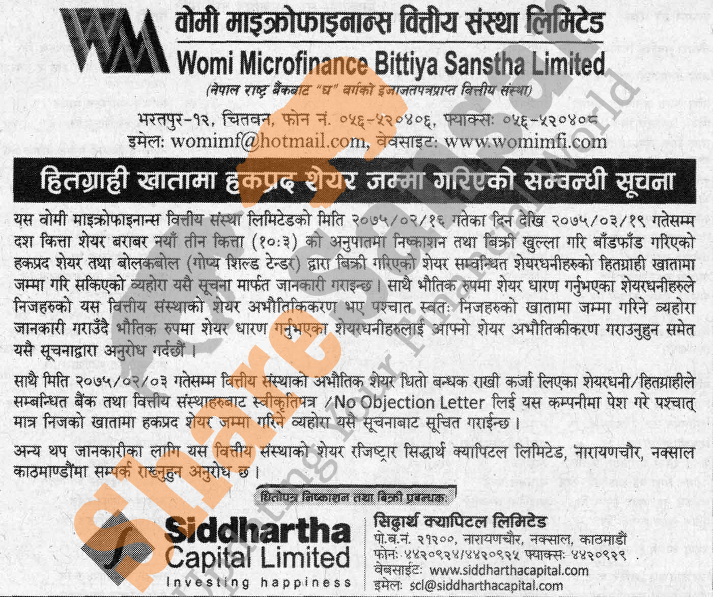 Womi Microfinance Bittiya Sanstha Limited is distributing 10:3 ratio right share directly to DEMAT accounts and urged its shareholders to dematerialize their shares.