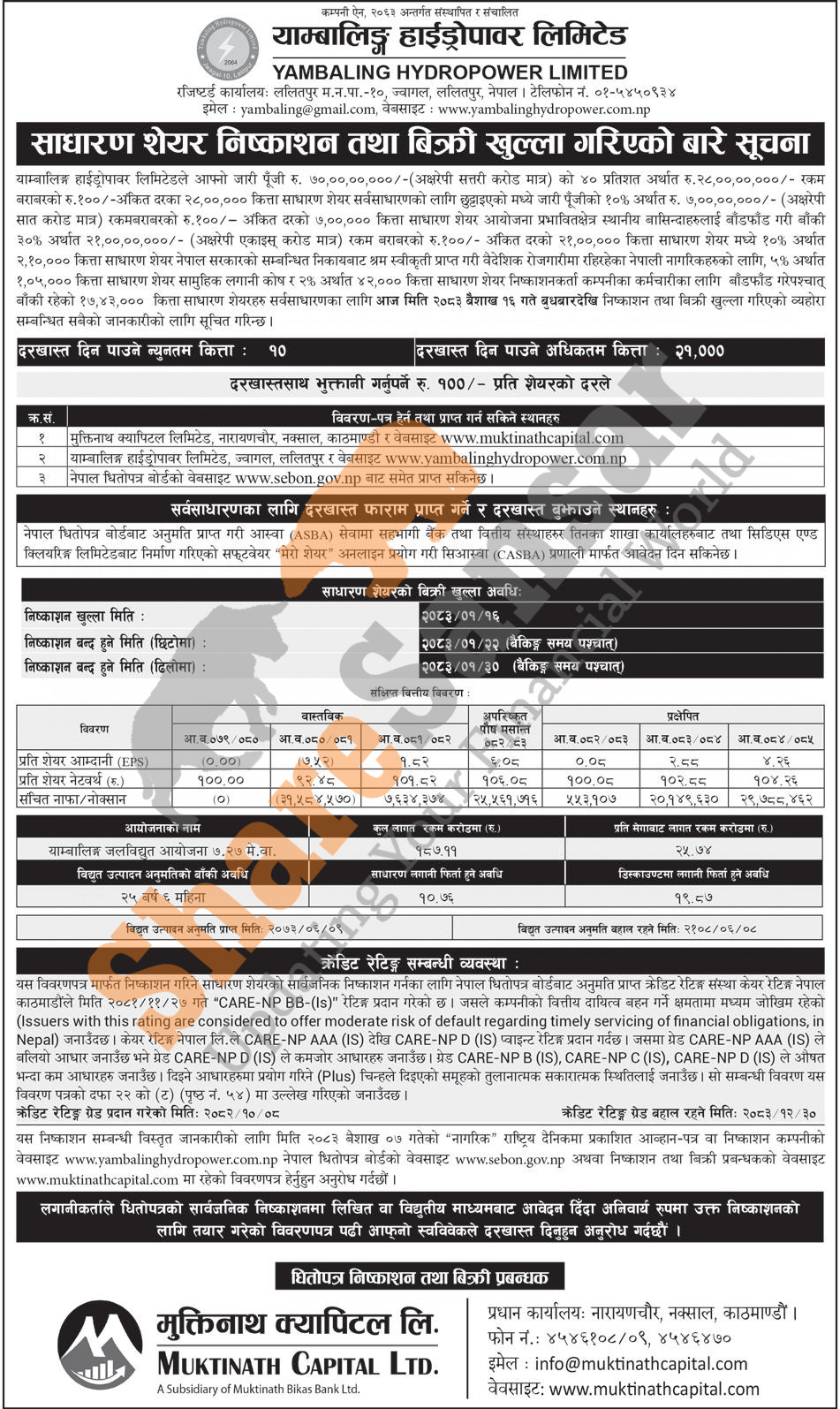 Yambaling Hydropower Limited is opening its 17,43,000 units IPO shares to the general public from today (16th Baisakh, 2083).