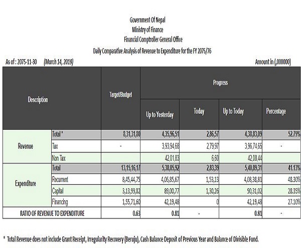 Eight months of FY 2075/76 gone; Revenue and expenditure at 52.79% and 41.13% of targeted value