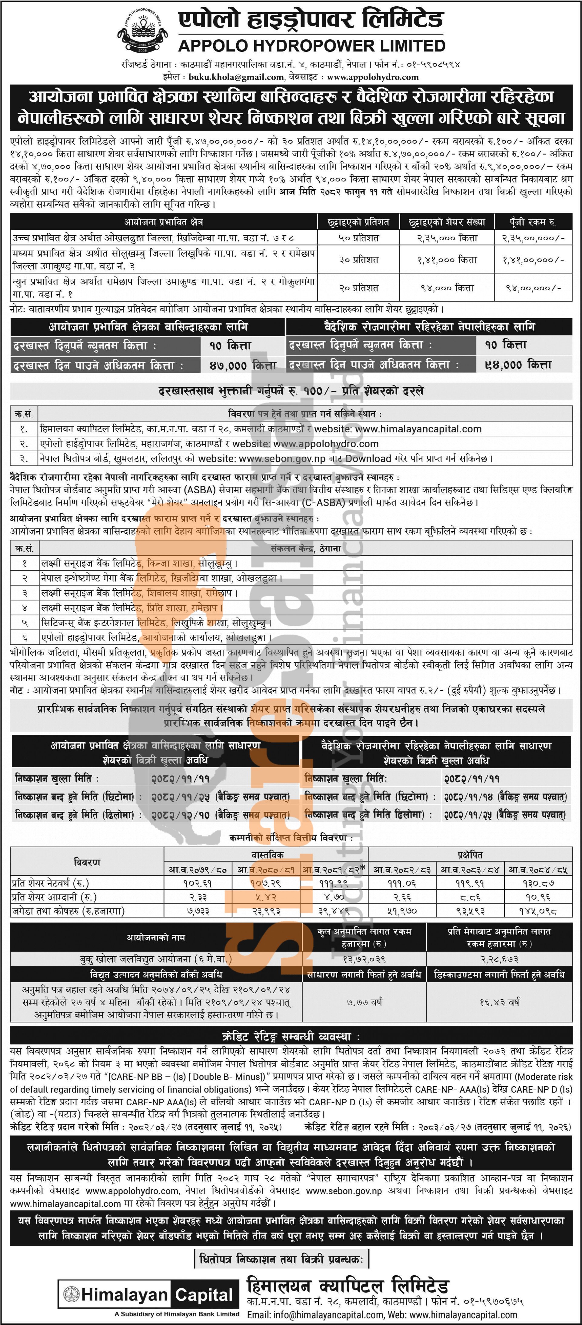 Appolo Hydropower Limited is opening its 4,70,000 units IPO shares to the project-affected locals of Okhaldhunga, Solukhumbhu and Ramechhap District and 94,000 units IPO Shares to Foreign Nepalese Employees from today (11th Falgun, 2082).