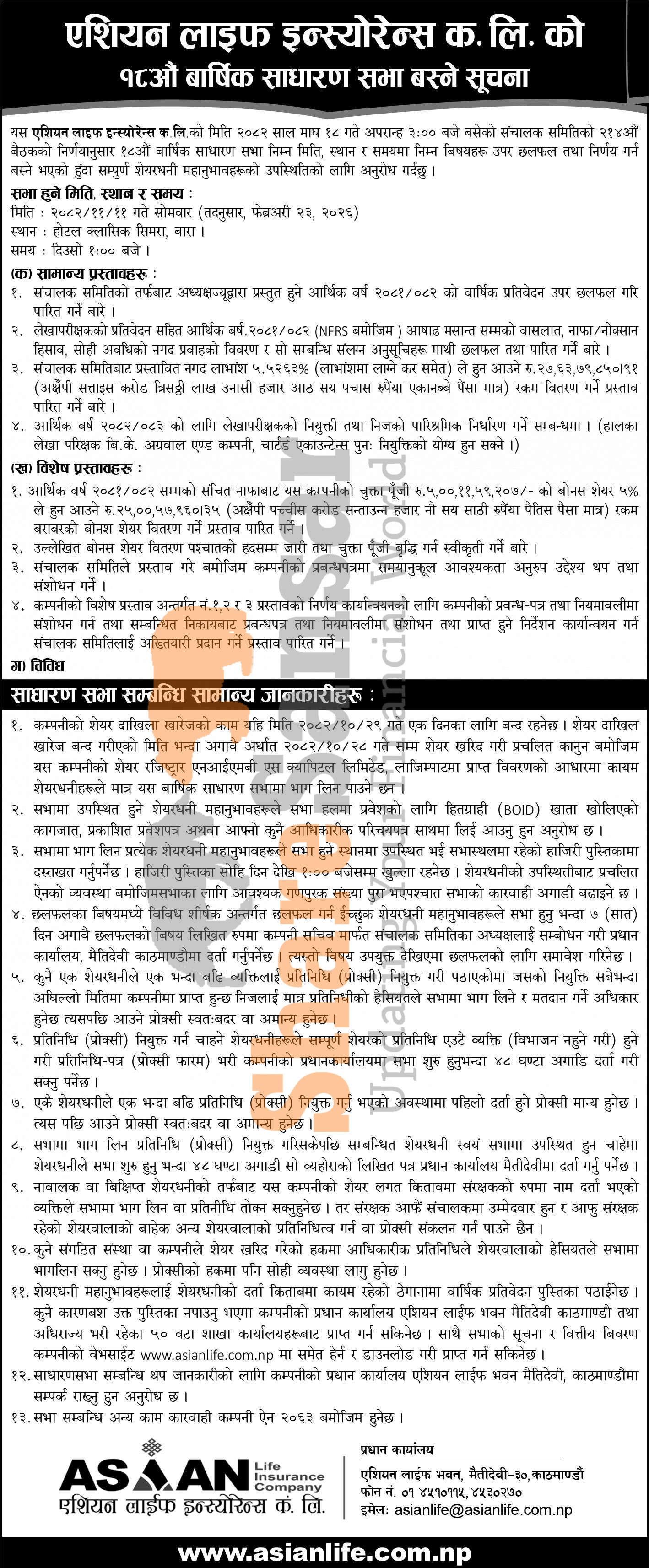 Asian Life Insurance Company Limited has announced its 18th AGM going to be held on 11th Falgun, 2082.