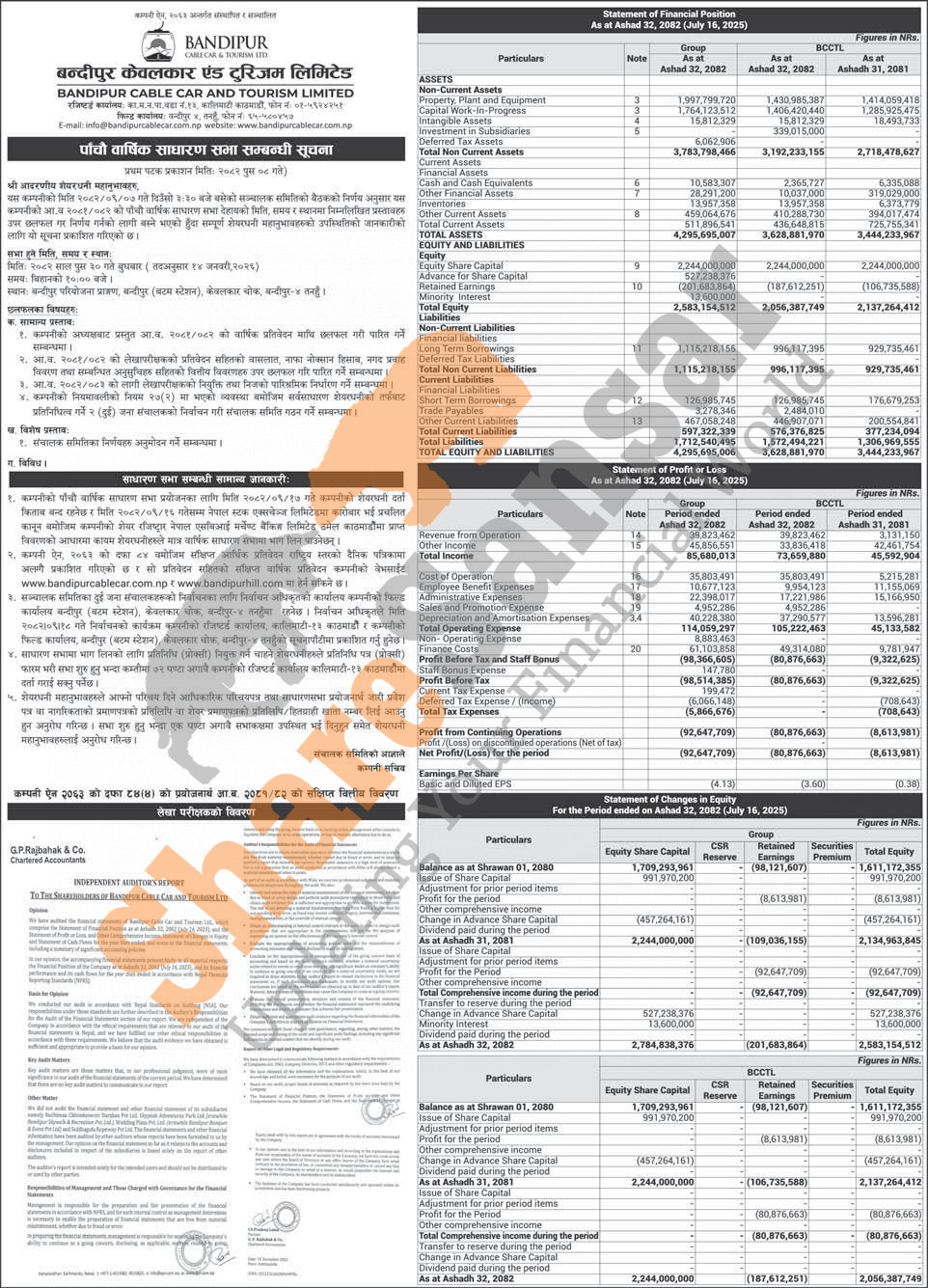 Bandipur Cable Car and Tourism Limited has announced its 5th AGM going to be held on 30th Poush, 2082 and has published its annual financial highlights of the fiscal year 2081/82.
