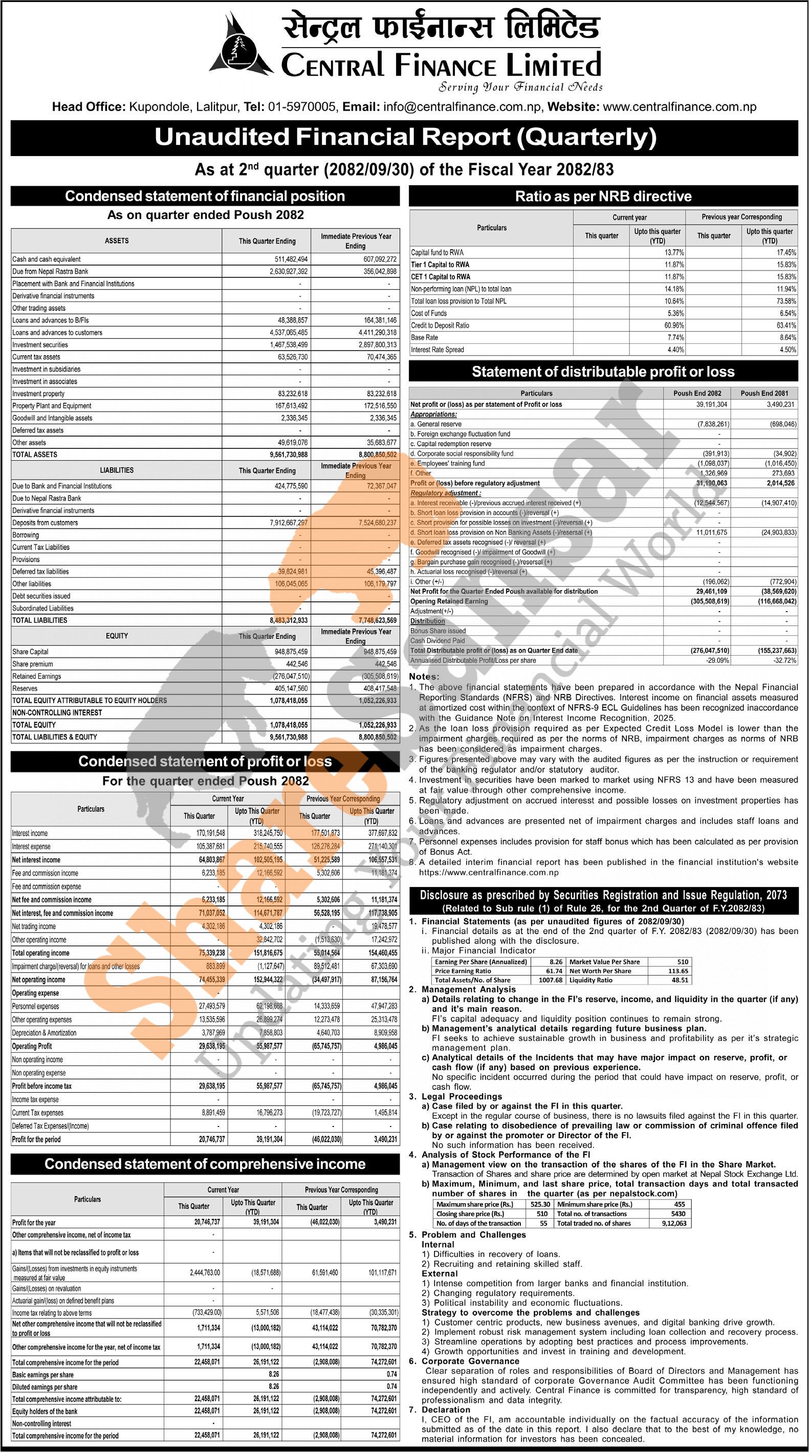 Central Finance Limited has posted a net profit of Rs 39.19 million and published its 2nd quarter company analysis of the fiscal year 2082/83.