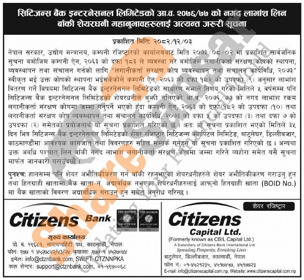 Citizens Bank International Limited has published a notice to its shareholders to collect unclaimed cash dividends for the fiscal year 2076/77 and has urged them to dematerialize their bank accounts.