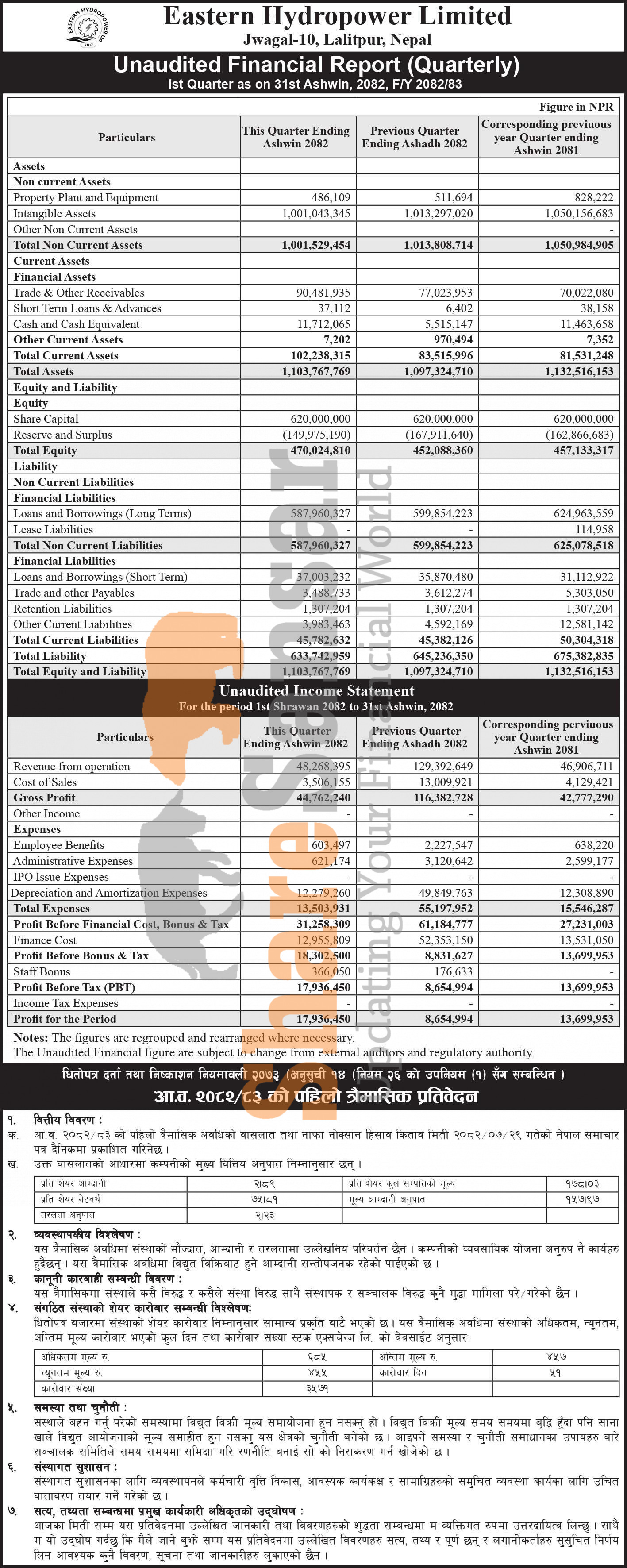 Eastern Hydropower Limited has posted a net profit of Rs 17.93 million and published its 1st quarter company analysis of the fiscal year 2082/83.