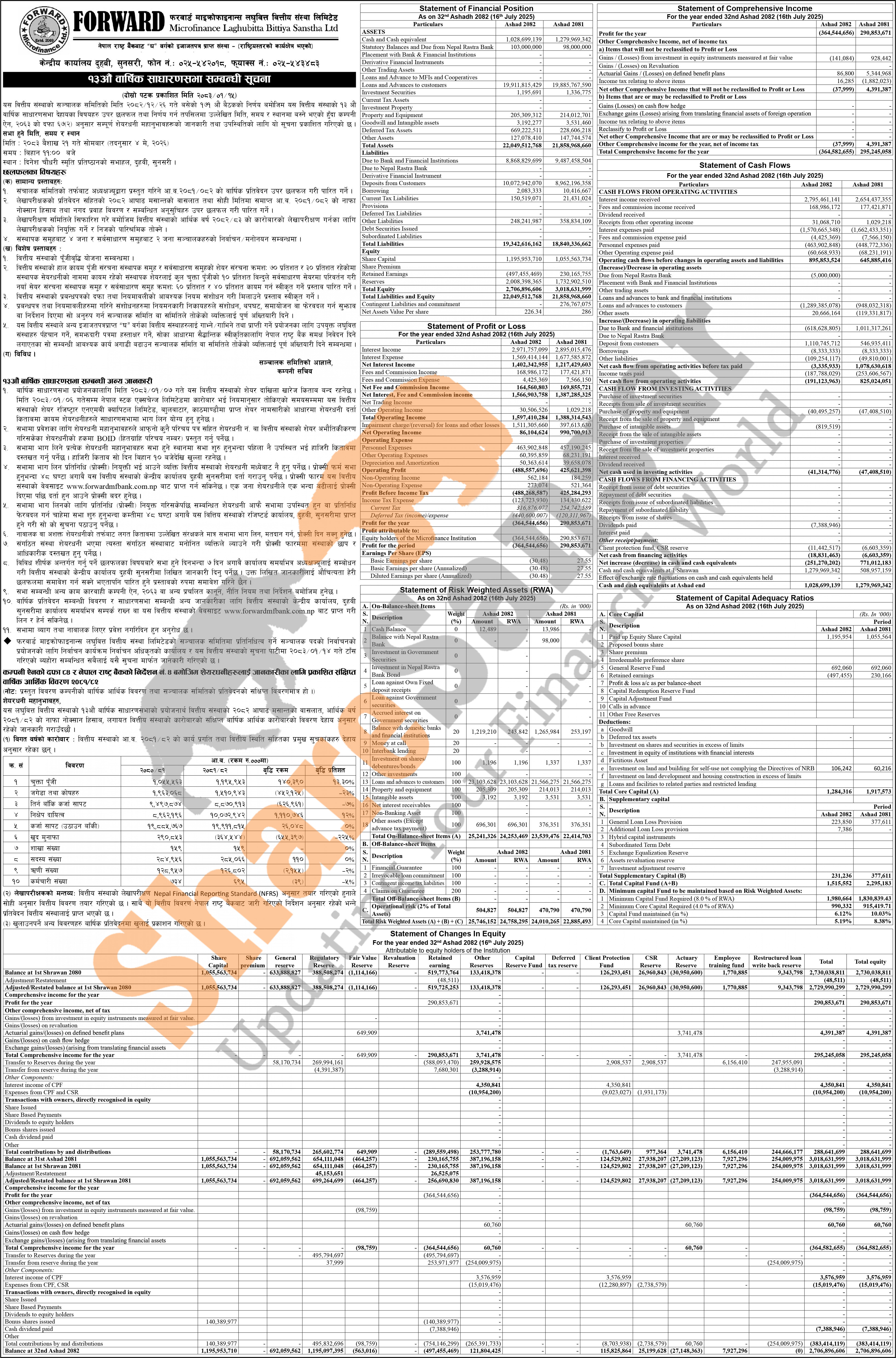Forward Microfinance Laghubitta Bittiya Sanstha Limited has announced its 13th AGM going to be held on 21st Baisakh, 2083 and published its annual financial statement of the fiscal year 2081/82.