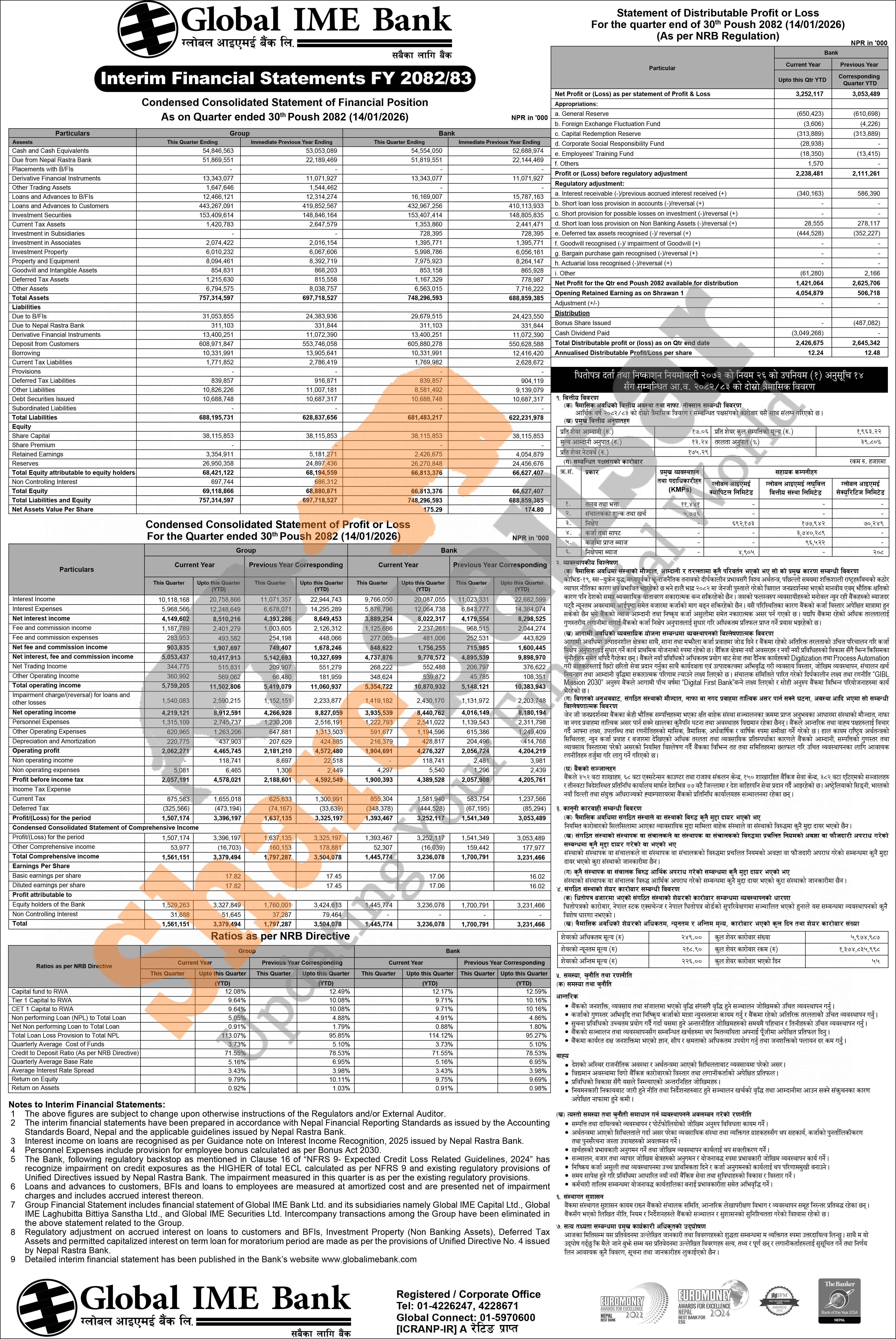 Global IME Bank Limited has posted a net profit of Rs 3.25 billion and published its 2nd quarter company analysis of the fiscal year 2082/83.