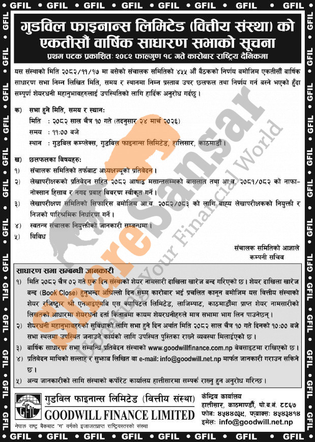 Goodwill Finance Company Limited has announced its 31st AGM going to be held on 10th Chaitra, 2082.