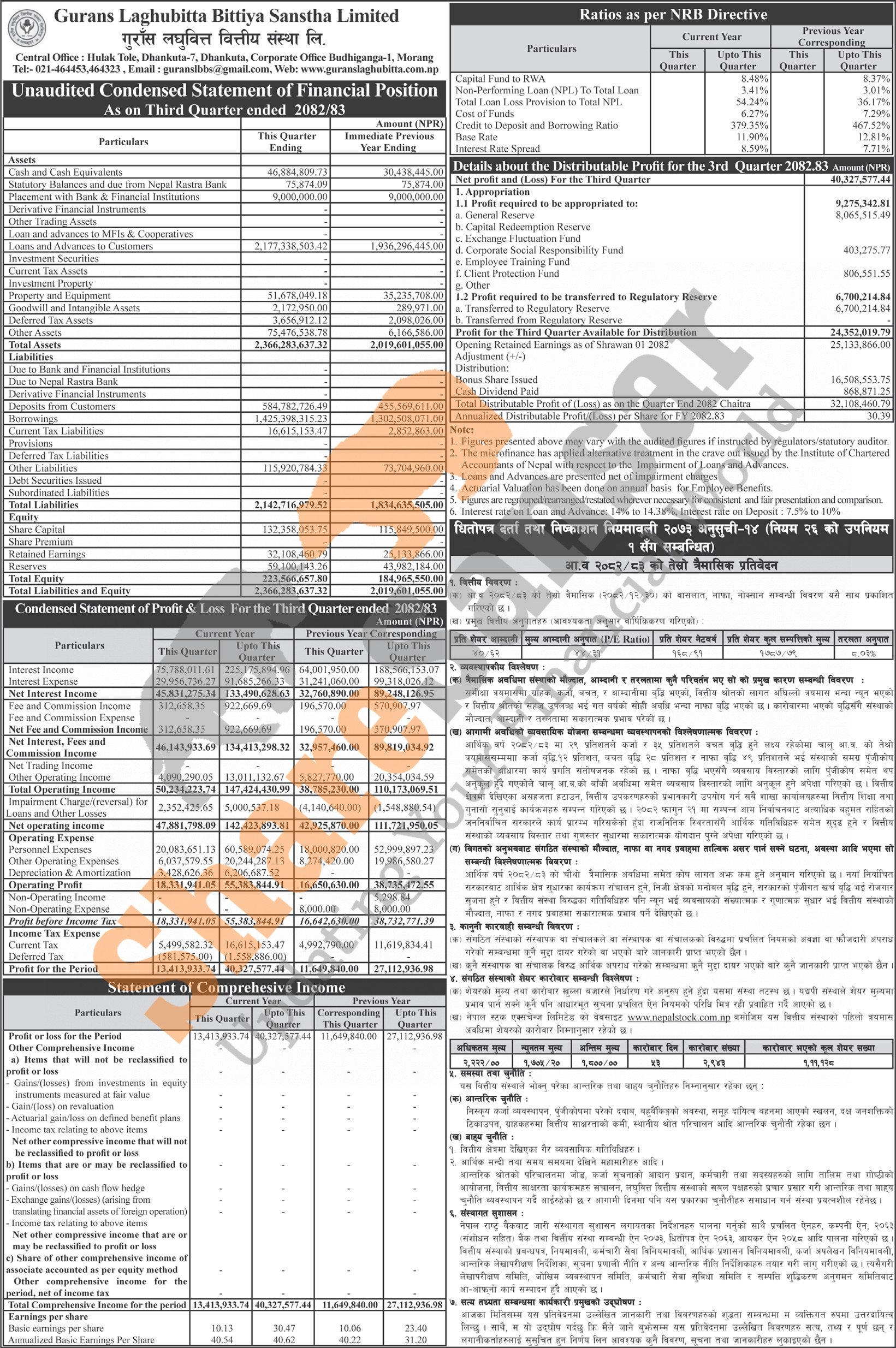 Gurans Laghubitta Bittiya Sanstha Limited has posted a net profit of Rs 40.32 million and published its 3rd quarter company analysis of the fiscal year 2082/83.