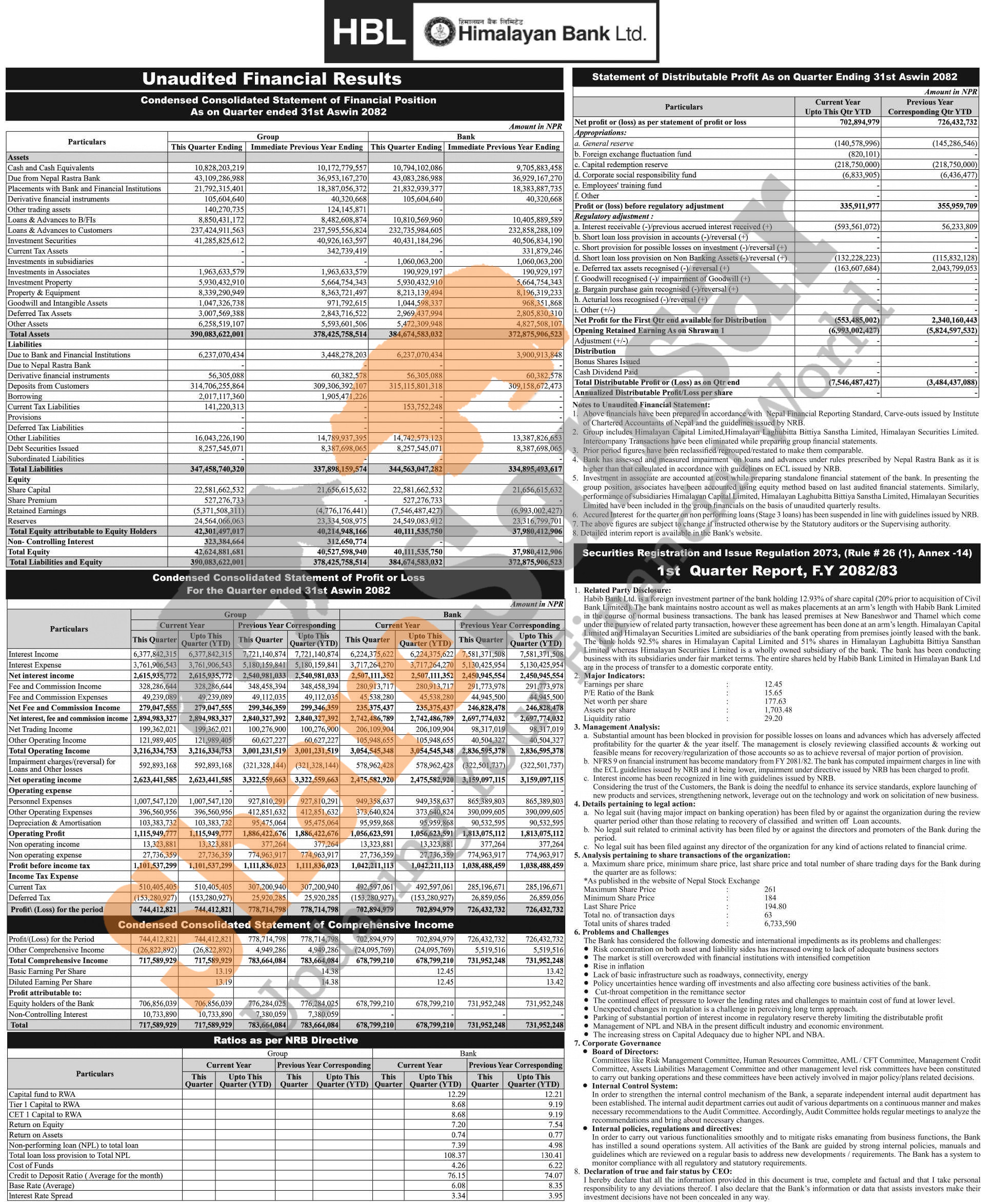 Himalayan Bank Limited has posted a net profit of Rs 702.89 million and published its 1st quarter company analysis of the fiscal year 2082/83.