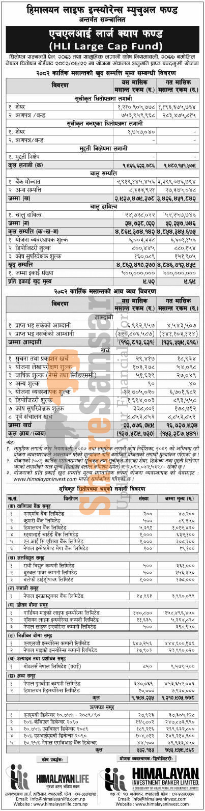 Himalayan Investment Banker Limited has published "HLI Large Cap Fund" Net Assets Value (NAV) till Kartik, 2082.