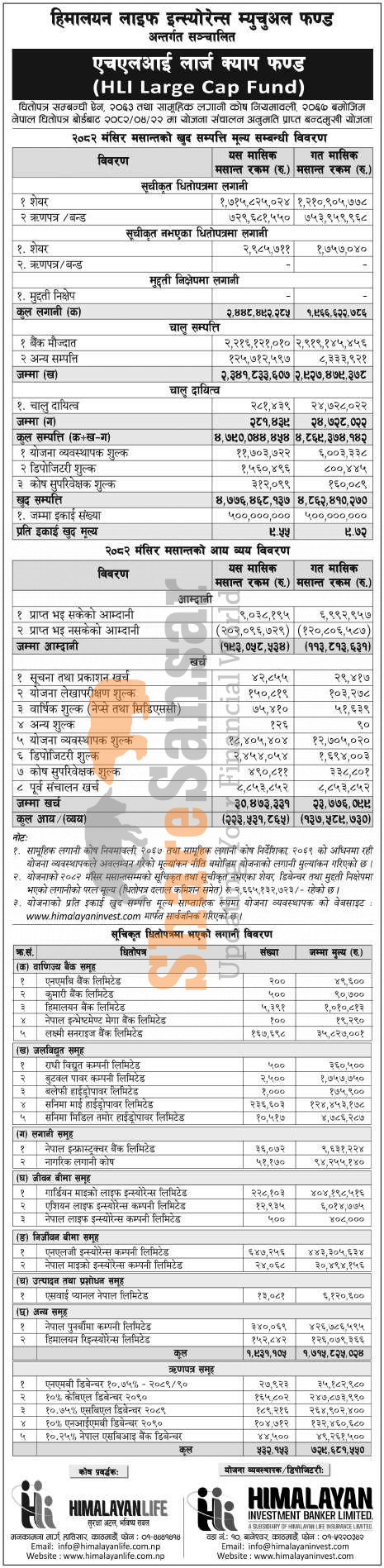Himalayan Investment Banker Limited has published "HLI Large Cap Fund" Net Assets Value (NAV) till Mangsir, 2082.