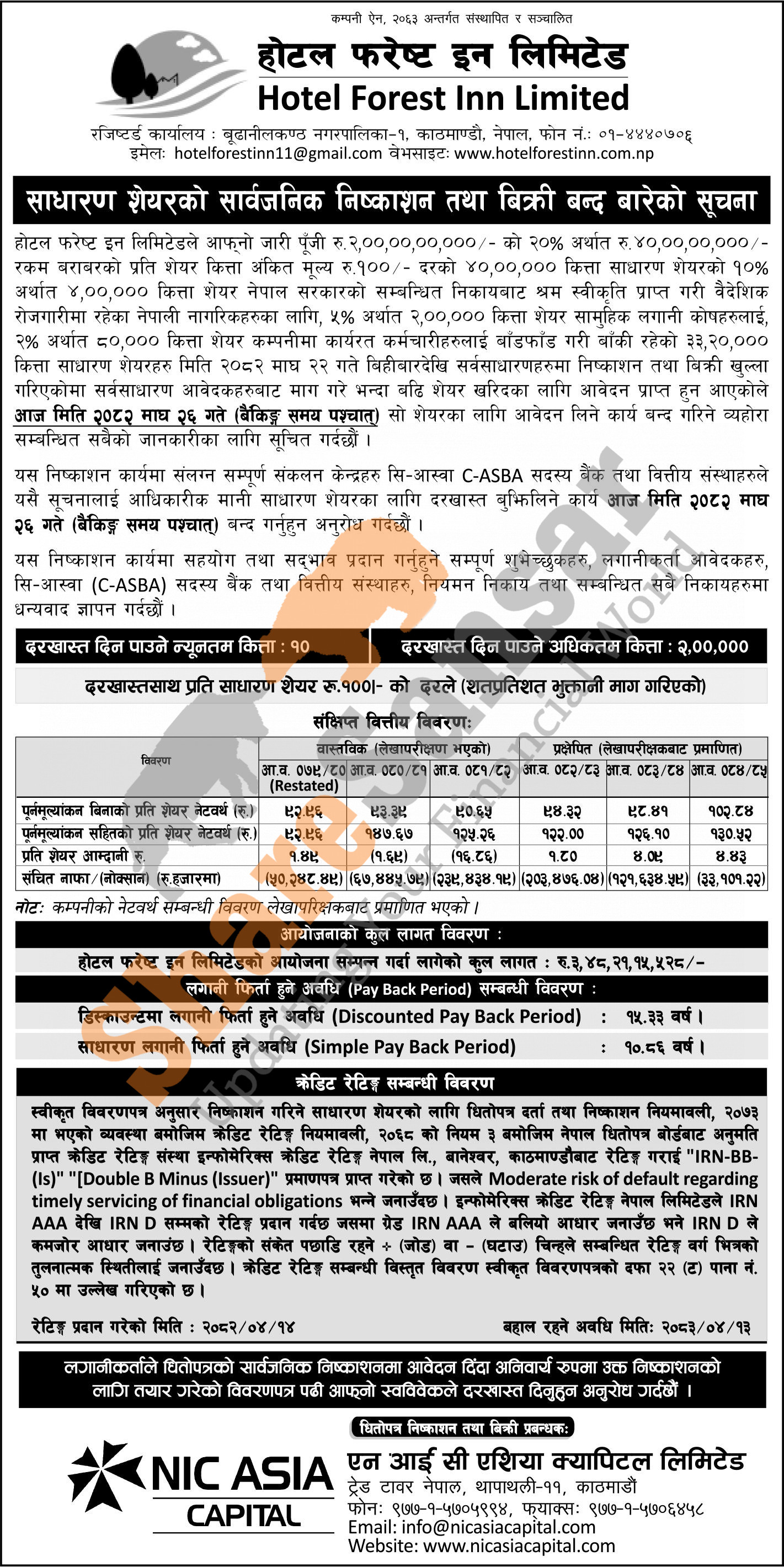 Hotel Forest Inn Limited is closing its 33,20,000 units IPO shares to the general public from today (26th Magh, 2082).