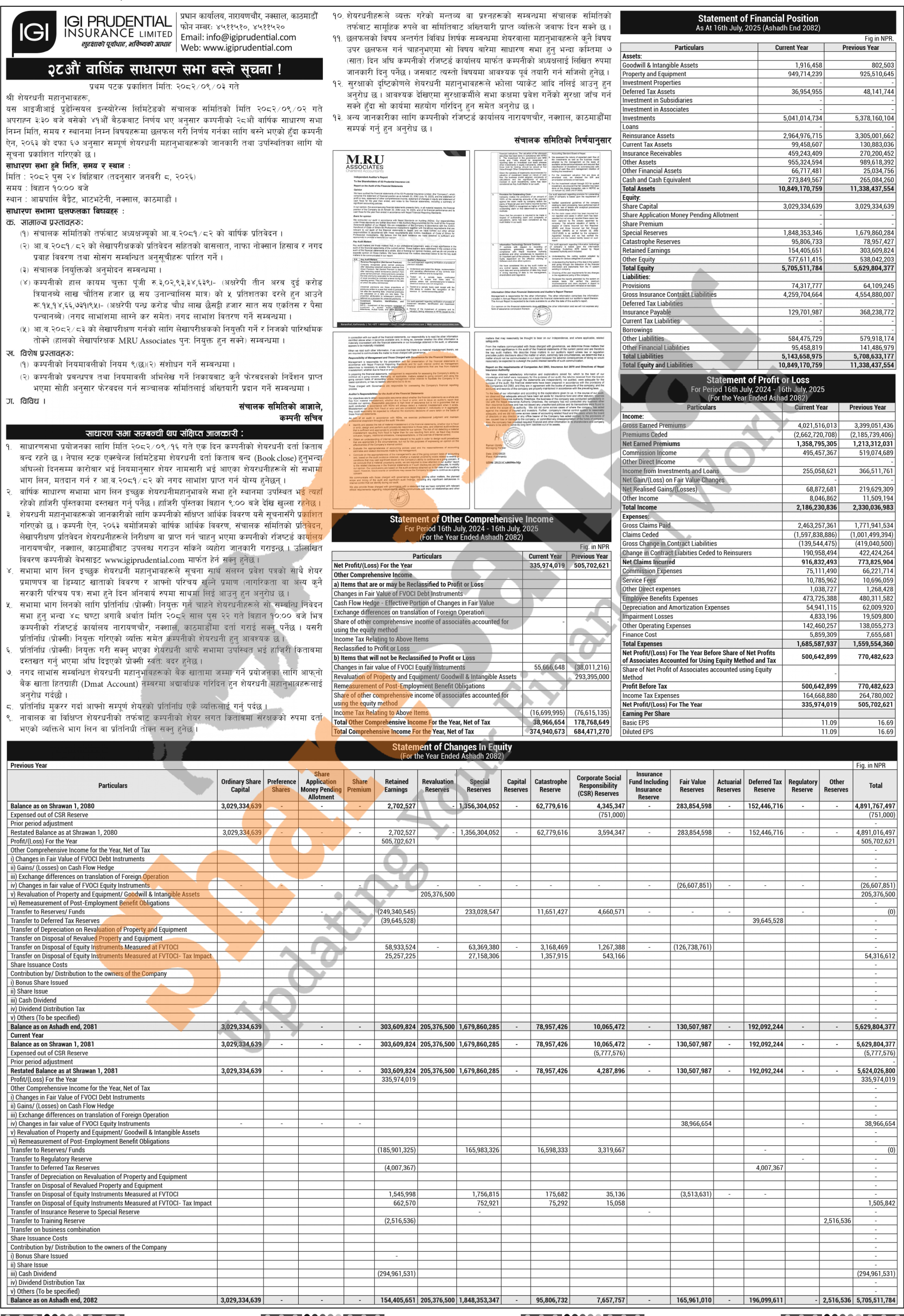 IGI Prudential Insurance Limited has announced its 28th AGM going to be held on 24th Poush, 2082 and published its annual financial statement of the fiscal year 2081/82.