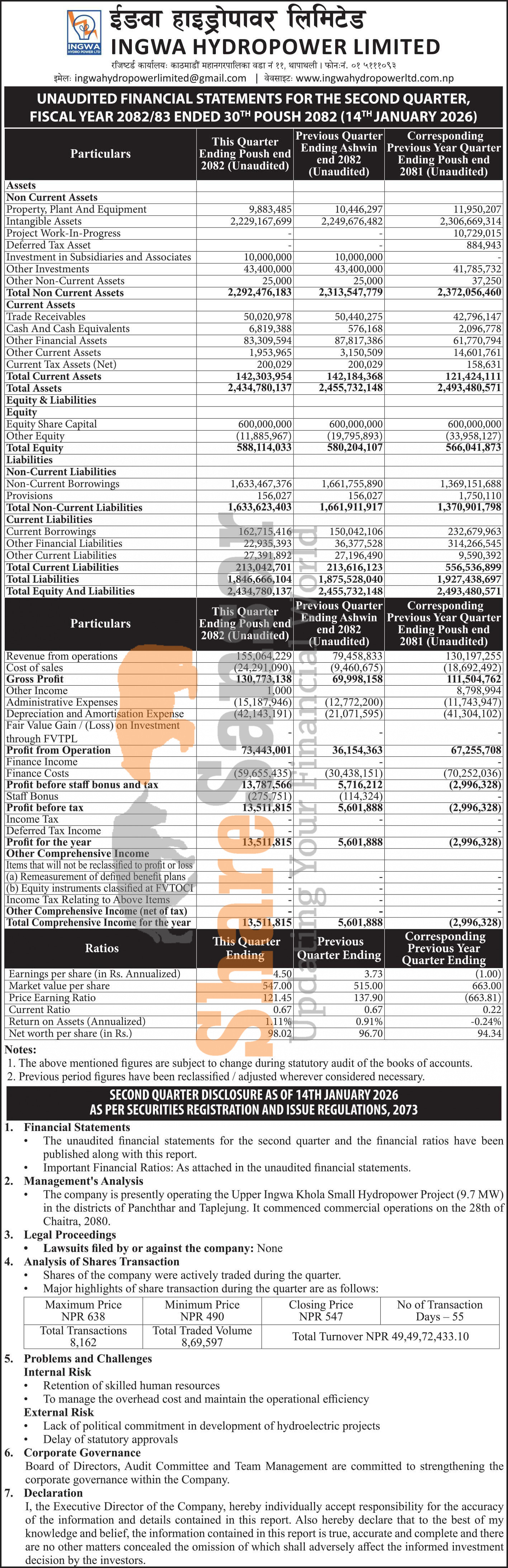 Ingwa Hydropower Limited has posted a net profit of Rs 13.51 million and published its 2nd quarter company analysis of the fiscal year 2082/83.