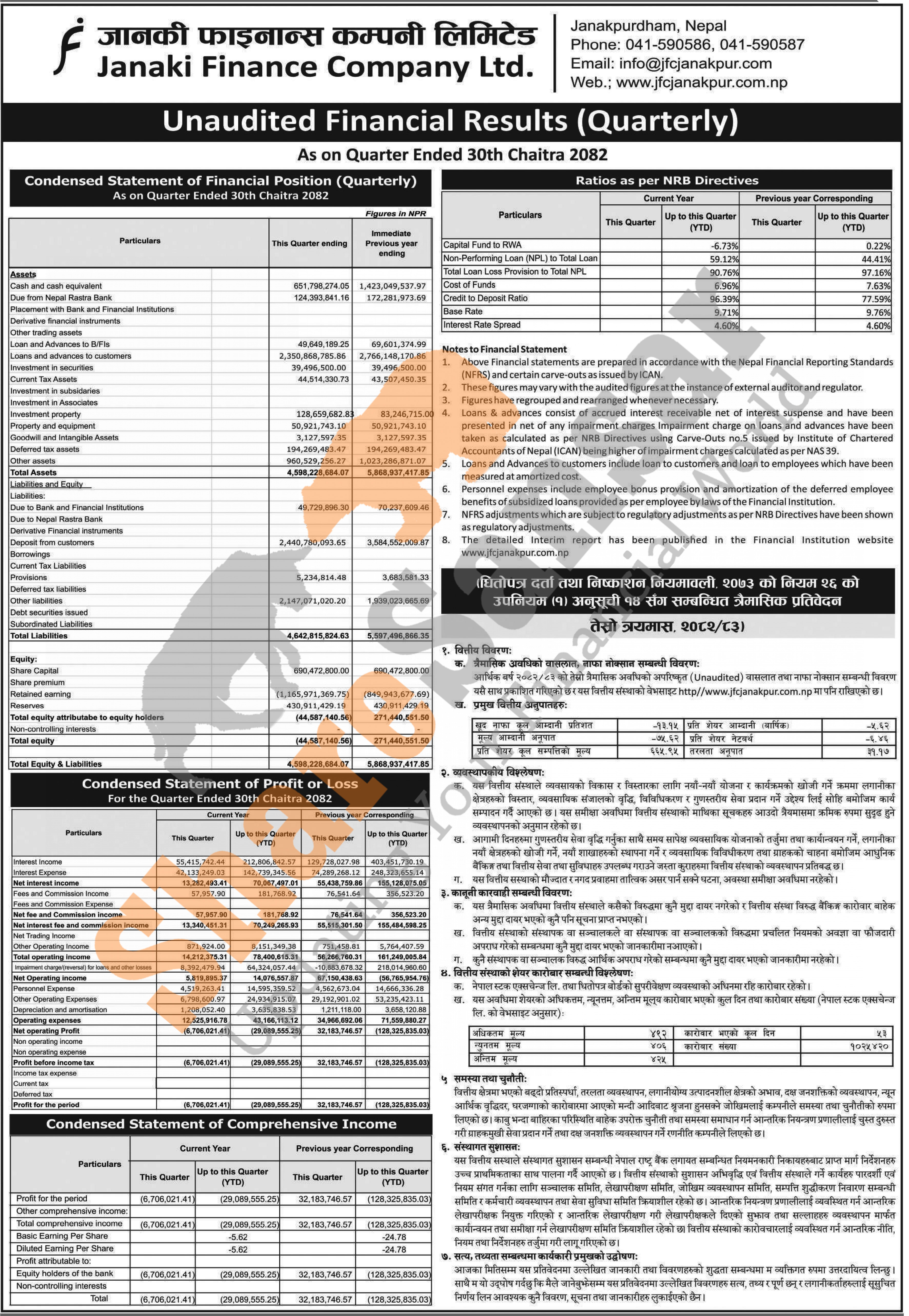 Janaki Finance Company Limited has posted a net loss of Rs 29.08 million and published its 3rd quarter company analysis of the fiscal year 2082/83.