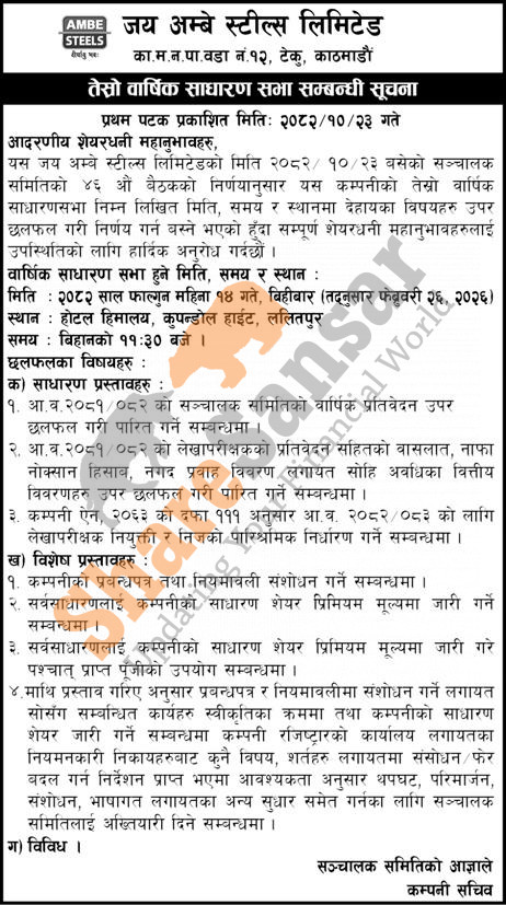 Jay Ambe Steels Limited has announced its 3rd AGM going to be held on 14th Falgun, 2082.