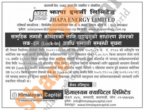 Jhapa Energy Limited has published a notice regarding the expiration of the lock-in period of Mutual Fund for all investors and stakeholders on 7th Chaitra, 2082.