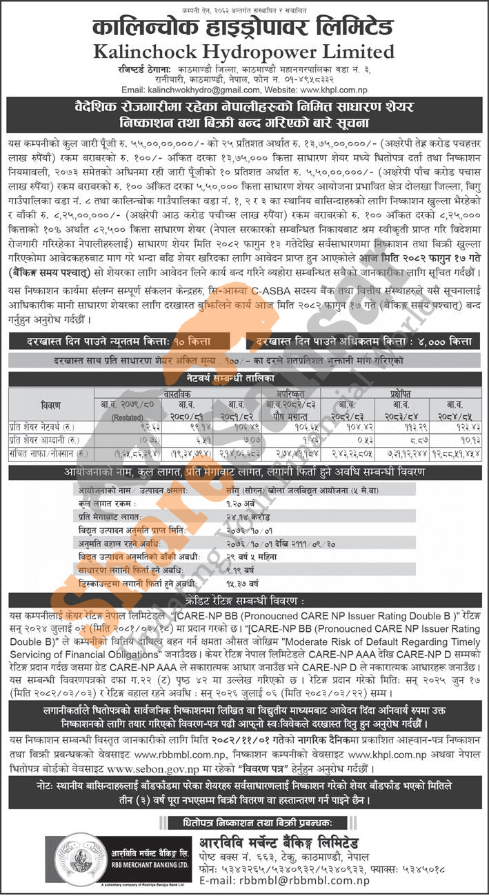 Kalinchowk Hydropower Limited is closing its 82,500 units IPO Shares to Foreign Nepalese Employees from today (17th Falgun, 2082).