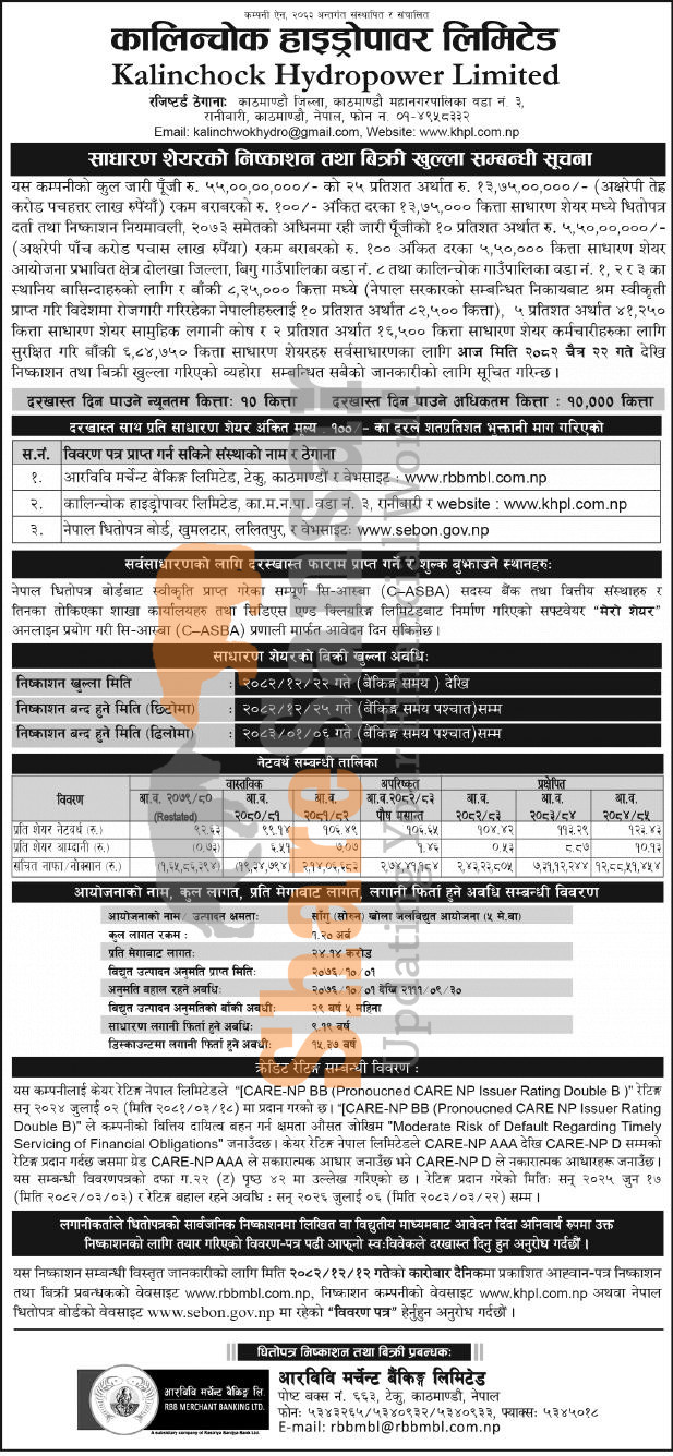 Kalinchowk Hydropower Limited is opening its 6,84,750 units IPO shares to the general public from today (22nd Chaitra, 2082).