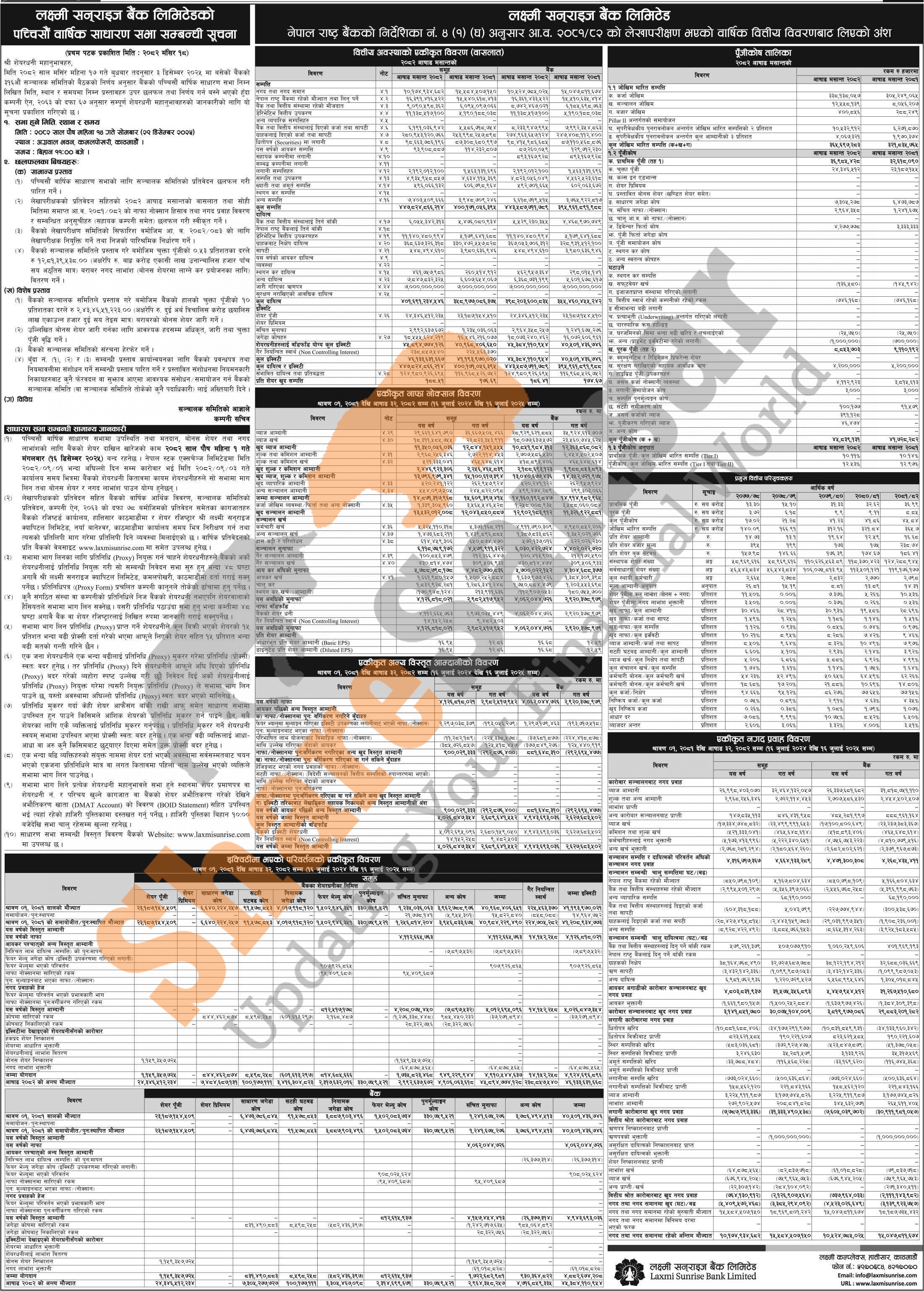 Laxmi Sunrise Bank Limited has announced its 25th AGM going to be held on 14th Poush, 2082 and published its annual financial statement of the fiscal year 2081/82.