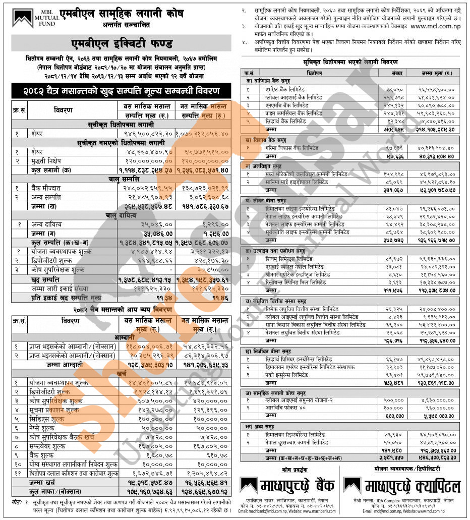 Machhapuchchhre Capital Limited has published “MBL Equity Fund” Net Asset Value (NAV) till Chaitra, 2082.